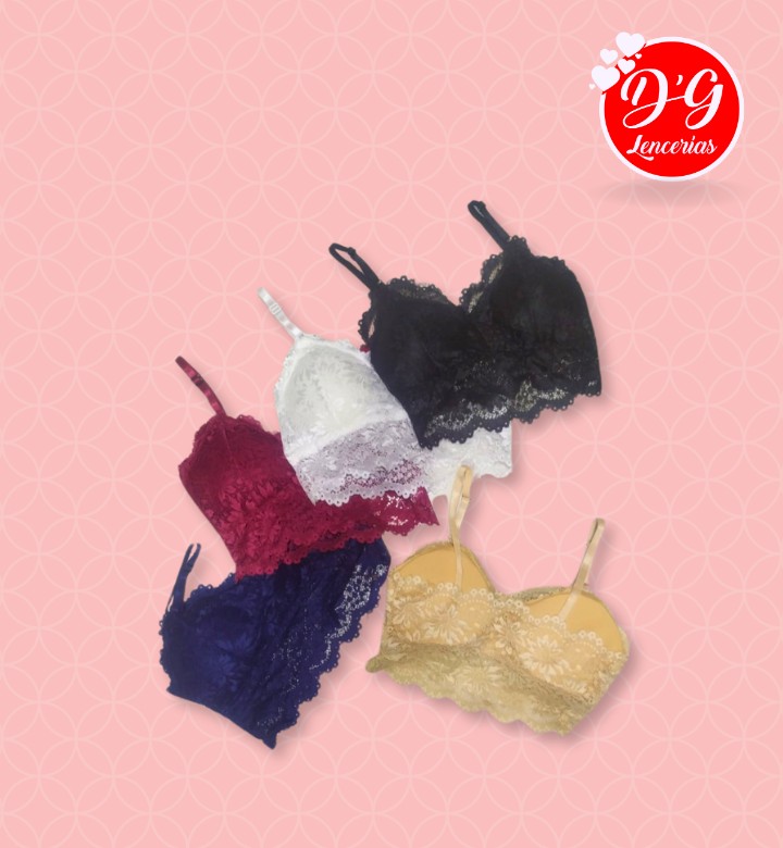 Es un bralette con full encaje con push removible sin broche, con caída en el busto.